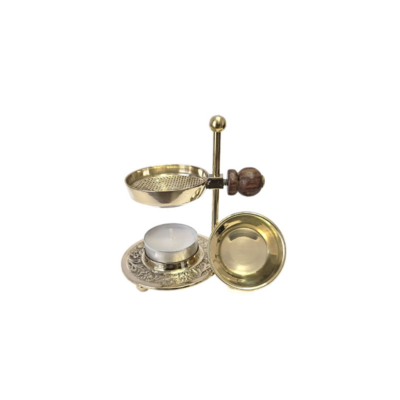1. Arzator pentru ierburi aromate si tamaie cu sita reglabila pe inaltime din alama de culoare aurie si surub de fixare cu lemn.
